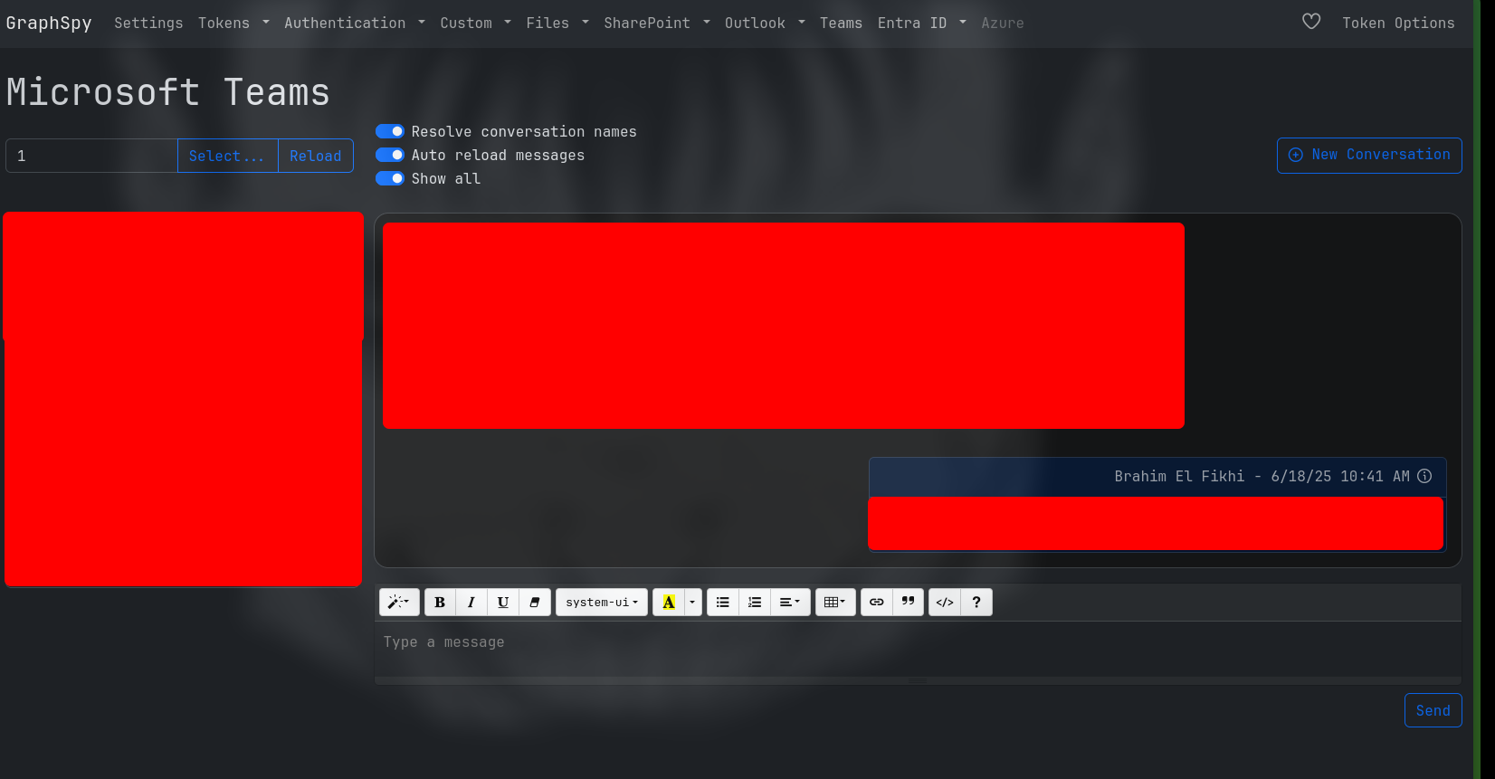 After retrieving the cookie, it can be leveraged with the post-exploitation tool GraphSpy to interact with Microsoft Graph API, allowing reading or sending emails, accessing or sending Teams messages, and more - all in the context of the compromised user.